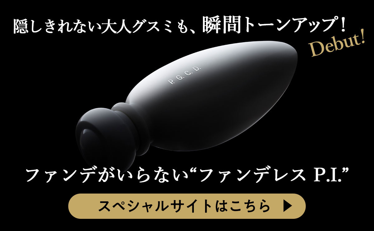 ファンデーションじゃないのにファンデ超え肌をかなえる「ファンデレス P.I.」は、ヨレ・ムラ知らずで、あとのせ自在。ササッと塗るだけで、まるで−7才肌※2 のように仕上がる大人の“トーンアップUV美容液”です。朝の寝ぼけ肌も、午後のクスミ・小ジワも、瞬間トーンアップ※1。クスミ女子の悩みを解消する※2 1本です。