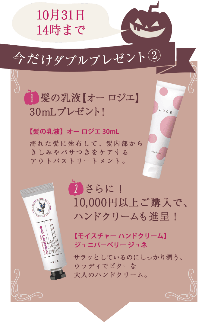 10月31日はハロウィン! 死者の霊と魔女や悪霊たちが入り混じる、お祭りの夜。目にも楽しい仮装のルーツは悪霊たちから身を守るためだったとか。P.G.C.D.では、“くすみおばけ”や“乾燥おばけ”からお肌を守るべく、スペシャルなアイテムをご用意しました! 華やかに優雅に、『特別なわたし』に変身してハロウィンを楽しみませんか? ログイン カートに入れる 一部会員様向けのキャンペーンとなります。ご了承ください。 ログイン カートに入れる 一部会員様向けのキャンペーンとなります。ご了承ください。 ログイン カートに入れる 一部会員様向けのキャンペーンとなります。ご了承ください。 ログイン カートに入れる 一部会員様向けのキャンペーンとなります。ご了承ください。 ログイン カートに入れる 一部会員様向けのキャンペーンとなります。ご了承ください。