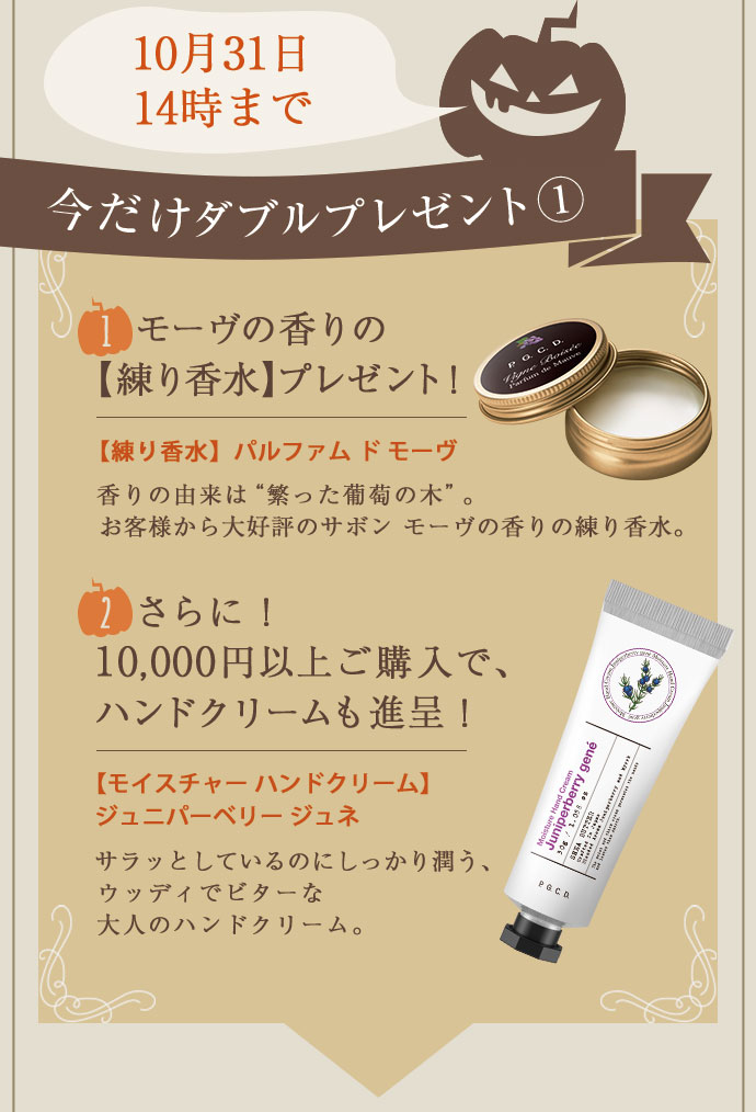 10月31日はハロウィン! 死者の霊と魔女や悪霊たちが入り混じる、お祭りの夜。目にも楽しい仮装のルーツは悪霊たちから身を守るためだったとか。P.G.C.D.では、“くすみおばけ”や“乾燥おばけ”からお肌を守るべく、スペシャルなアイテムをご用意しました! 華やかに優雅に、『特別なわたし』に変身してハロウィンを楽しみませんか? ログイン カートに入れる 一部会員様向けのキャンペーンとなります。ご了承ください。 ログイン カートに入れる 一部会員様向けのキャンペーンとなります。ご了承ください。 ログイン カートに入れる 一部会員様向けのキャンペーンとなります。ご了承ください。 ログイン カートに入れる 一部会員様向けのキャンペーンとなります。ご了承ください。 ログイン カートに入れる 一部会員様向けのキャンペーンとなります。ご了承ください。